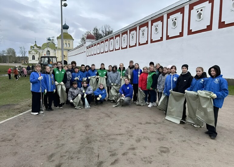 Волонтёры привели в порядок территорию вокруг Тихвинского монастыря и Захаровского парка: убрали мусор, старые ветки, листву и подмели дорожки.